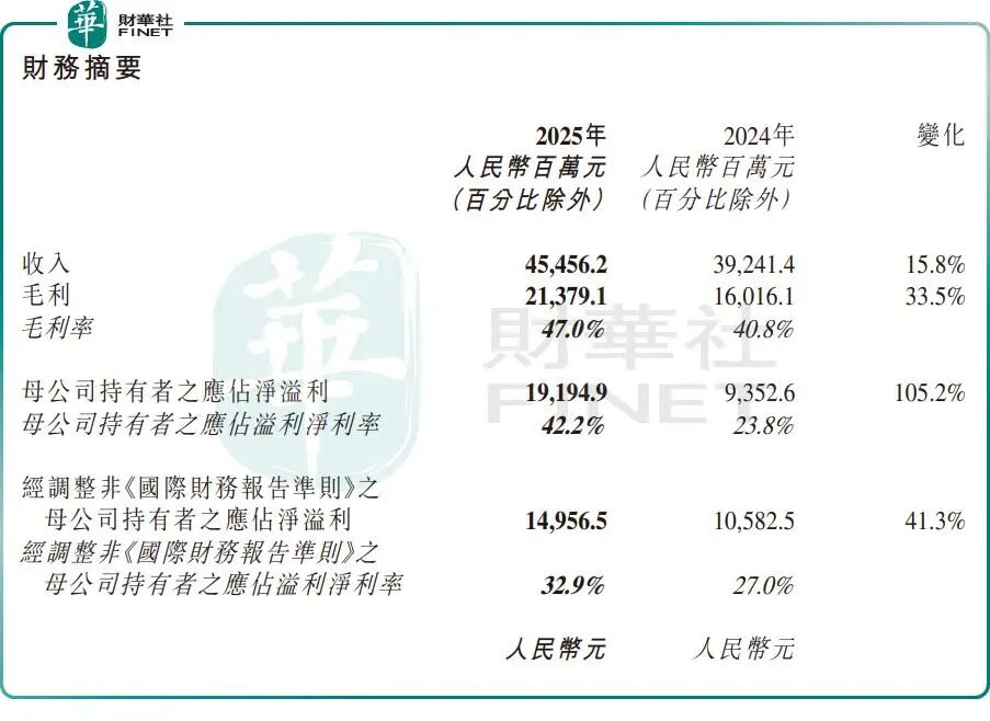 盈利端改善更是抢眼,2025年,公司归母净利润191.9亿元,同比增长约105.2%;经调整利润为149.6亿元,同比增长41.3%;毛利率47.0%,较上年提升6.2个百分点。