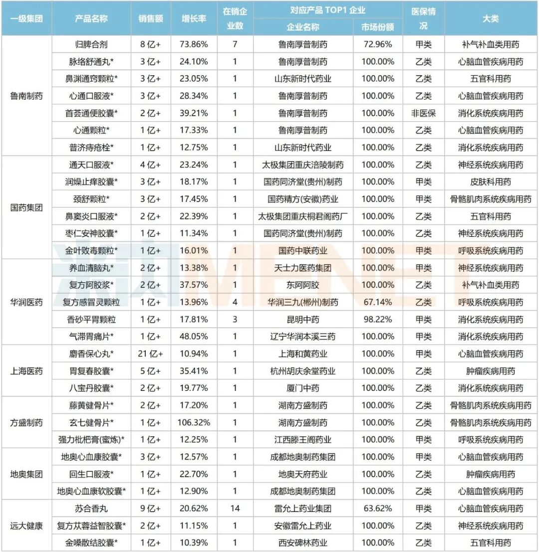 从厂家竞争格局看,108个中成药中,有7个由鲁南制药占据TOP1市场份额,有6个由国药集团占据TOP1市场份额,有5个由华润医药占据TOP1市场份额;上海医药、方盛制药、地奥集团、远大健康均有3个品种占据TOP1市场份额;步长制药、人福医药、佐力药业等10家企业均有2个品种占据TOP1市场份额;此外,津药达仁堂、健民药业、康缘药业、以岭药业等亦有独家品种在列。