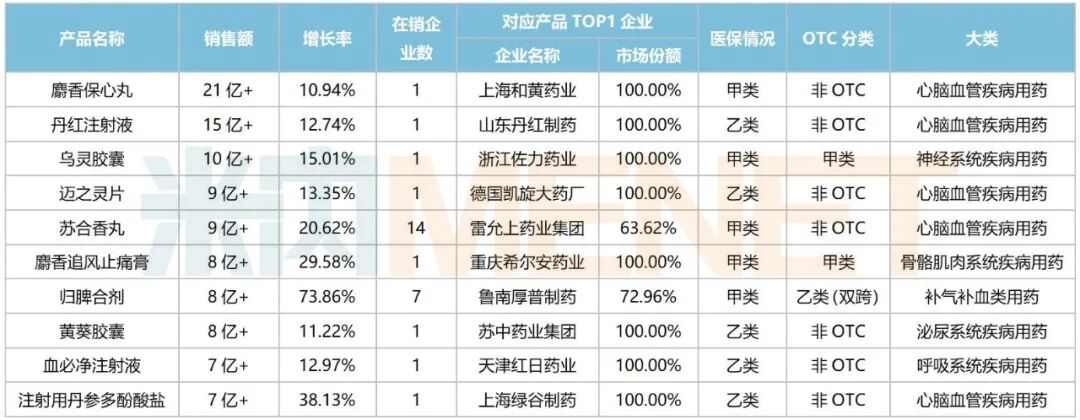 16个超5亿品种中,上海和黄药业的麝香保心丸、山东丹红制药的丹红注射液、浙江佐力药业的乌灵胶囊3个独家品种均超10亿元,分布在心脑血管疾病用药、神经系统疾病用药2个治疗大类。