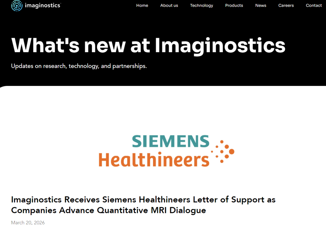 2026年3月20日,尚未通过FDA审批的初创公司Imaginostics宣布收到西门子医疗(Siemens Healthineers)的Letter of Support(支持函),双方就ImagiView™和ImagiSight™两款定量MRI产品与西门子MAGNETOM MRI系统的技术整合展开探索性对话。