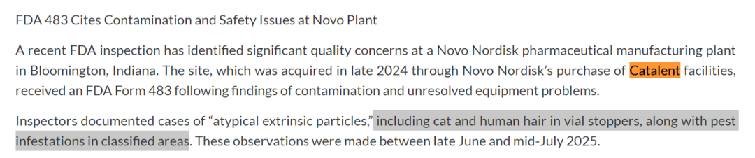 2025年6月到7月,FDA对布卢明顿工厂的检查发现:无菌生产环境中存在猫毛和人类毛发。