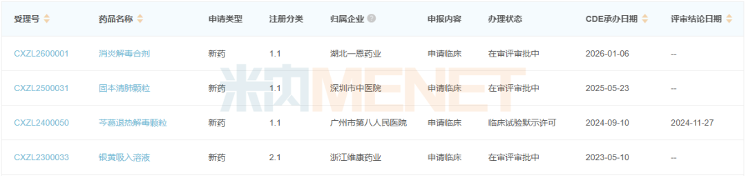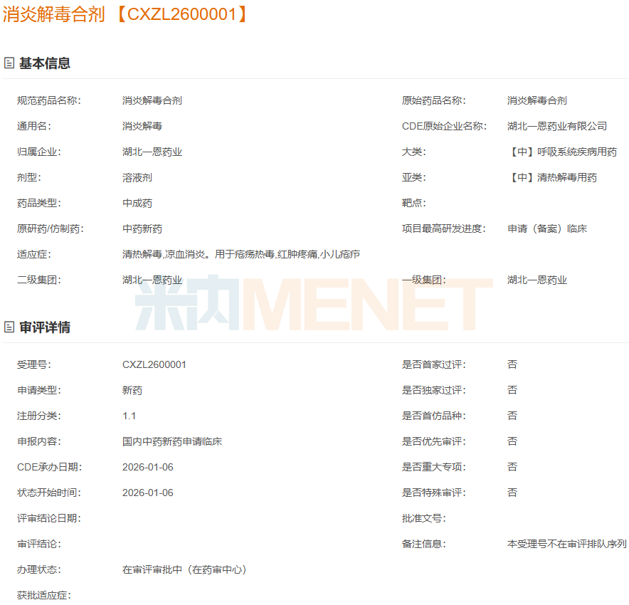 今年1月,湖北一恩药业的消炎解毒合剂申请临床获CDE受理,该产品为中药1.1类新药,有清热解毒、凉血消炎功效,用于疮疡热毒、红肿疼痛、小儿疮疖。