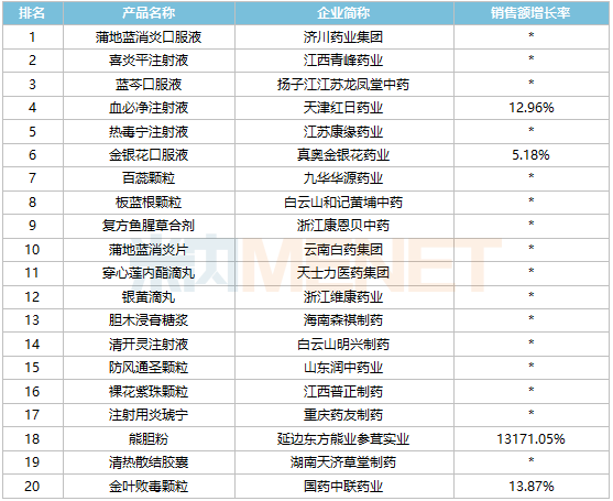 12个独家品种上榜,包括济川药业集团的蒲地蓝消炎口服液、青峰医药的喜炎平注射液、扬子江江苏龙凤堂中药的蓝芩口服液、天士力医药集团的穿心莲内酯滴丸、江西普正制药的裸花紫珠颗粒等,其中,国药中联药业的金叶败毒颗粒首次晋身TOP20品牌。