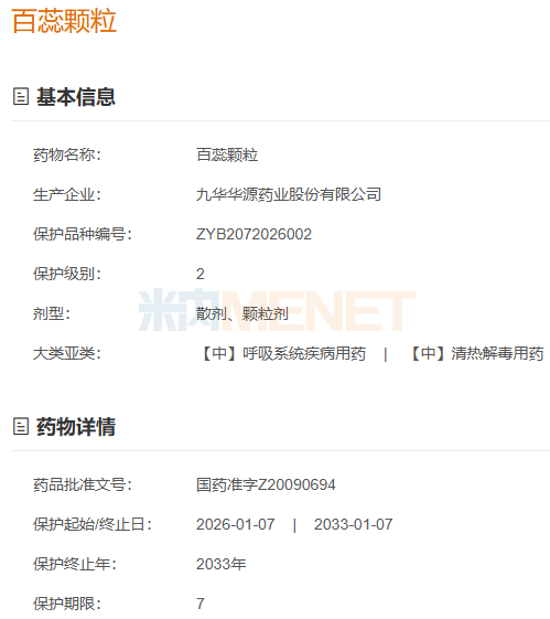 今年1月,国家药监局官网发布公告,九华华源药业的百蕊颗粒获批为首家中药二级保护品种。该产品是国家医保乙类、国家基药品种,有清热消炎、止咳化痰功效,用于急/慢性咽喉炎、气管炎、鼻炎、感冒发热、肺炎等,连续多年在中国三大终端六大市场位居清热解毒中成药TOP10品牌之列,2023年-2024年销售额均超过5亿元。据了解,九华华源药业是国家高新技术企业,拥有130余个药品批文,其中百蕊颗粒、玉叶金花清热片等独家品种覆盖儿科、呼吸科等领域。