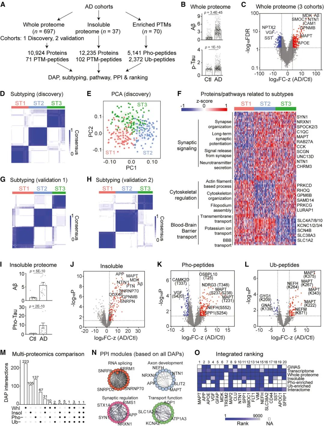 阿尔茨海默病可分为三个亚型:主导突触信号紊乱型、主导细胞骨架调节异常型、以及主导血脑屏障运输功能障碍型。这些亚型在独立队列和脑脊液蛋白质组数据中得到了验证。