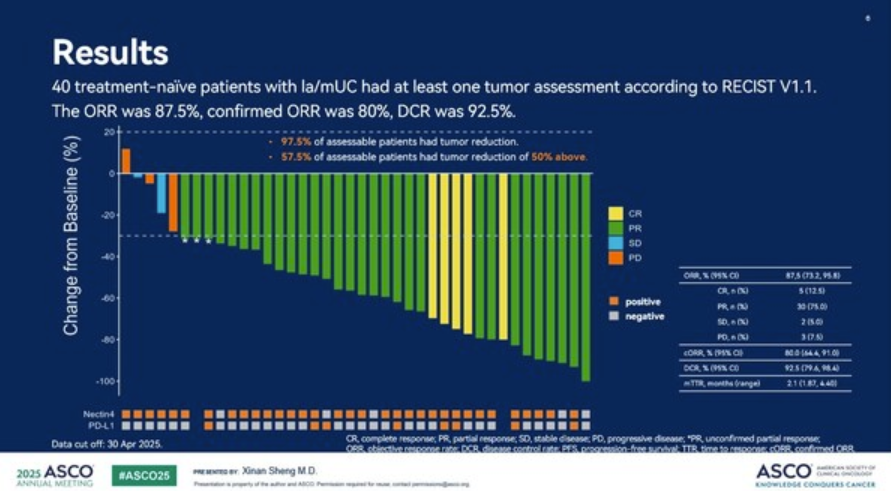 根据2025年ASCO大会上的公开数据,9MW2821+特瑞普利单抗一线资料尿路上皮癌的初步临床数据,40例患者ORR达到87.5%,DCR为92.5%,亚组分析显示Nectin-4阴性患者ORR为100%,意味着9MW2821的应用范围可以覆盖所有患者,不需要筛选Nectin-4表达水平。