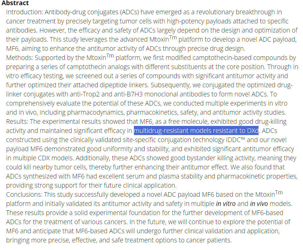 ADC领域,迈威生物开发了基于MF-6毒素的新一代ADC技术平台,并在此基础上开发了CDH17 ADC,临床前研究中显示抗肿瘤效果优于MMAE和DXd等,且有望克服DXd等ADC耐药,目前已经获批临床。