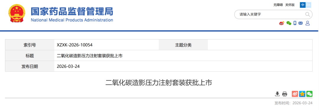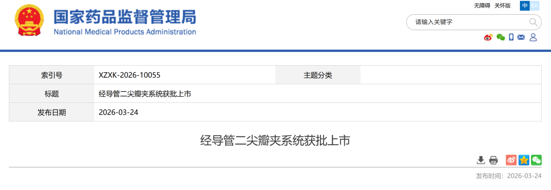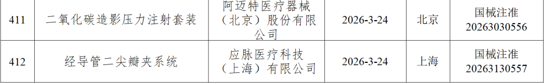 近日,国家药品监督管理局(NMPA)批准了应脉医疗科技(上海)有限公司的经导管二尖瓣夹系统(国械注准20263130557)以及阿迈特医疗器械(北京)股份有限公司的二氧化碳造影压力注射套装(国械注准20263030556)创新产品注册申请。