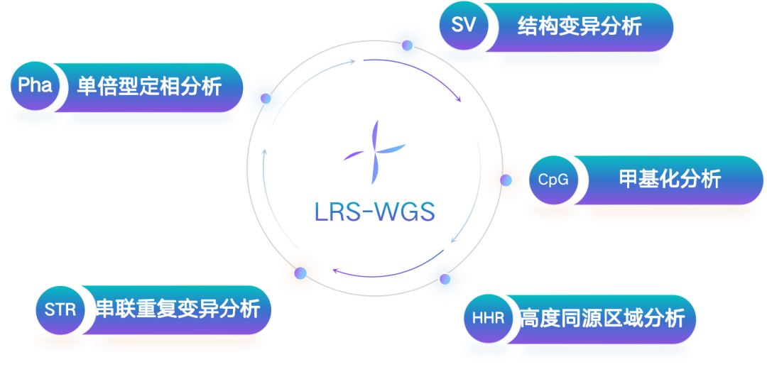 三代全基因组检测可一次性同步检测单核苷酸变异(SNVs)、微缺失/重复(InDel)、拷贝数变异(CNVs)、SV(倒位、易位等)、串联重复(短串联重复、可变数目串联重复)等全类型变异,尤其在单体型分析、结构变异分析、串联重复分析及甲基化分析等方面具有显著优势。