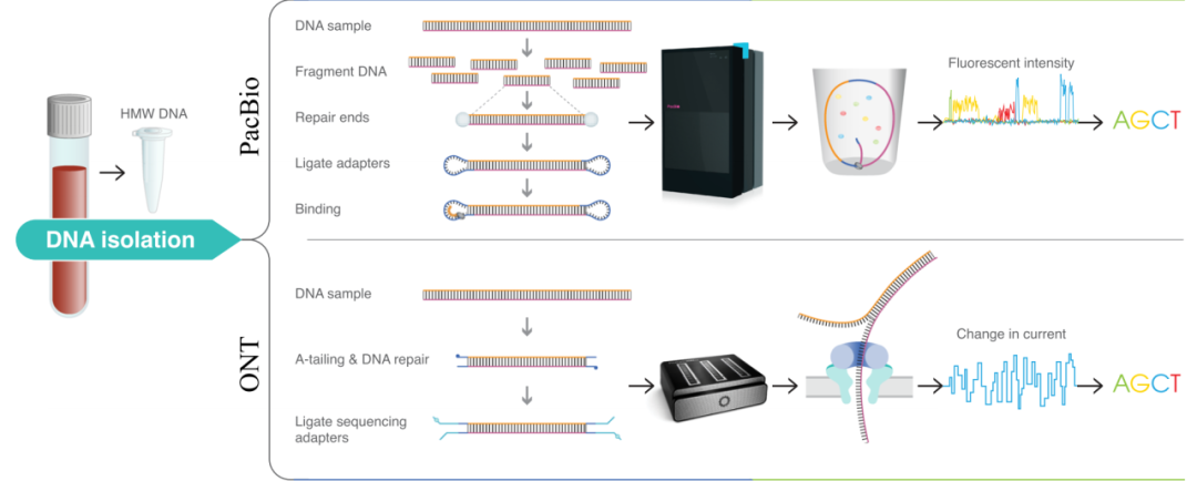 ▲PacBio与ONT平台的建库及测序工作流程[2]