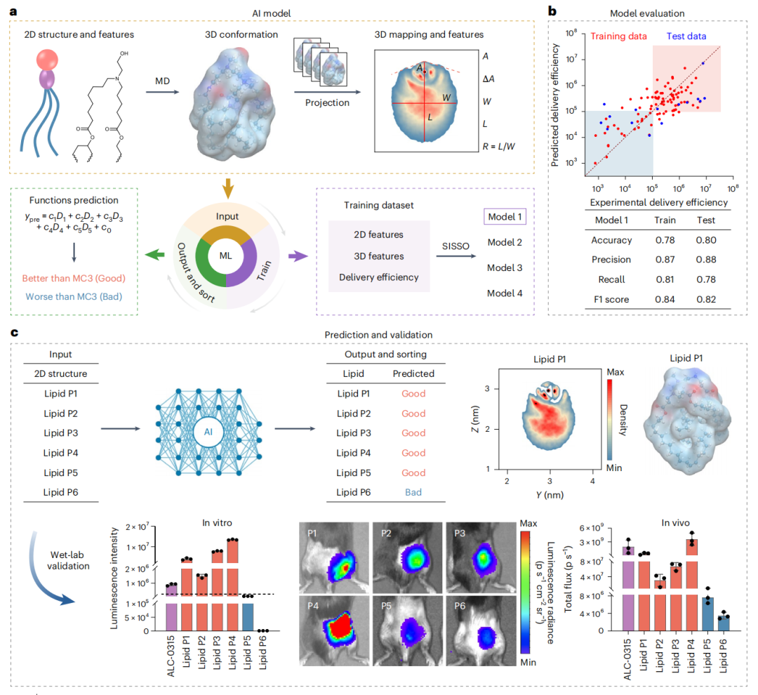 有了构象数据,研究团队将其转化为 2D 密度图像,并提取了 22 个空间特征(例如头部角度、长宽比等),结合 6 个化学特征,训练了机器学习模型,该模型从 100 种代表性脂质中学习,最终能准确预测新脂质的递送效率。