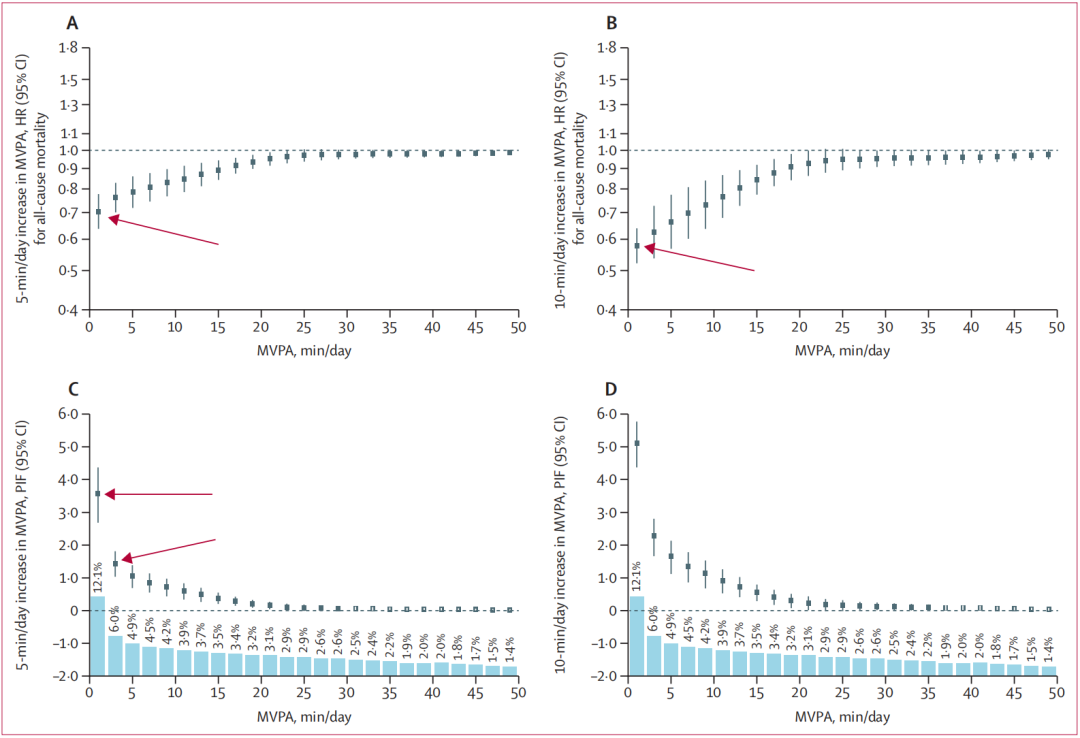 研究团队计算了这些改变可能预防的死亡比例,结果令人惊讶。对于活动量最低的 20% 人群(他们平均每天进行约 2 分钟中高强度身体活动),每天增加 5 分钟的中高强度身体活动(例如以 5 公里/小时速度进行快走),可预防 6% 的死亡;而对于大多数人(除活动量最高的 20% 人群外的 80% 人群,他们平均每天进行约 17 分钟中高强度身体活动),每天增加 5 分钟高强度身体活动,可预防 10% 的死亡。