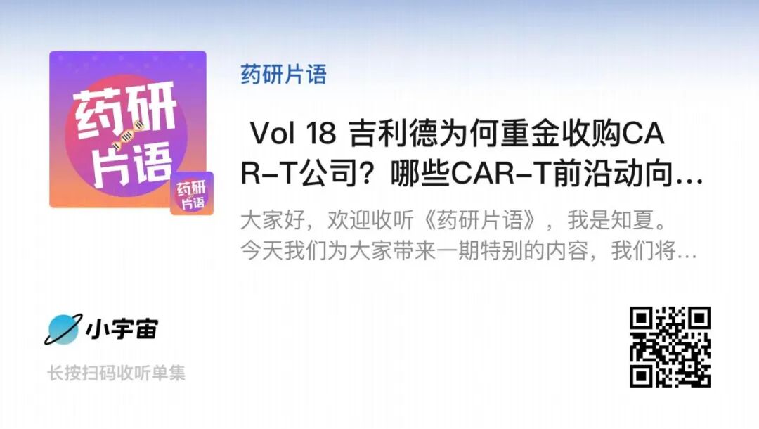 最后,欢迎大家关注我们在小宇宙上的播客栏目——药研片语。前两天我们深入聊了下CAR-T细胞治疗领域的前沿动向,欢迎大家收听并与我们交流~