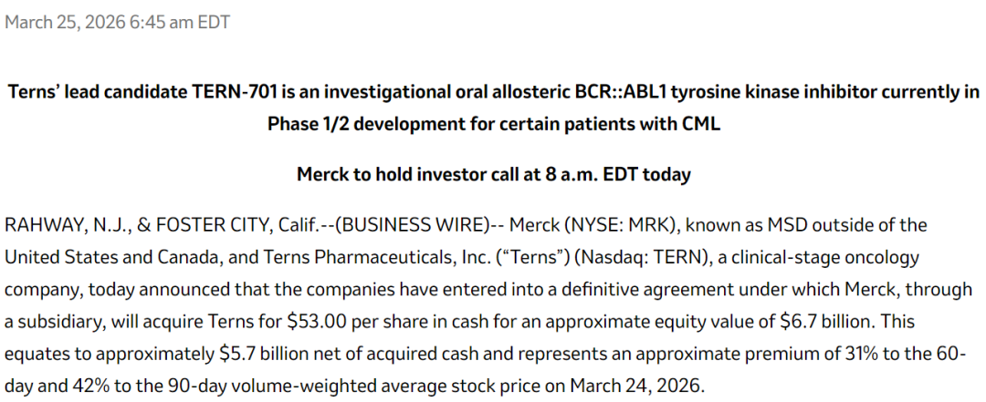 67亿美元:默沙东收购Terns Pharmaceuticals