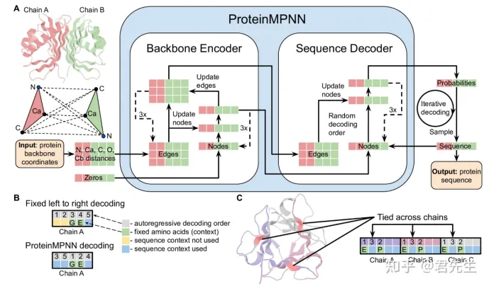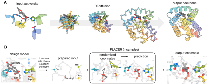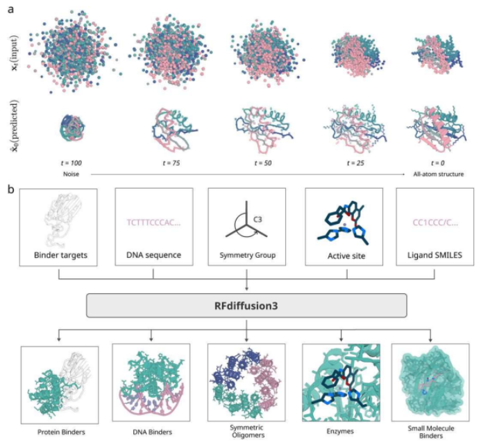 a)Rfdiffusion3生成蛋白质骨架结构,ProteinMPNN精细的生成氨基酸序列。