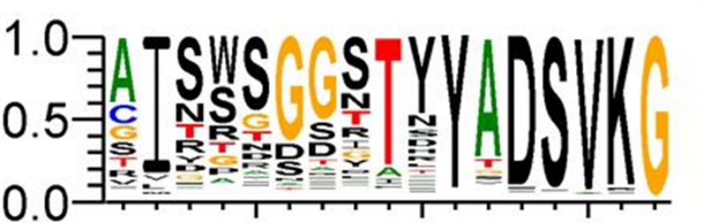 3)绘制序列Logo,可视化的展示每个位点的氨基酸频率和保守性