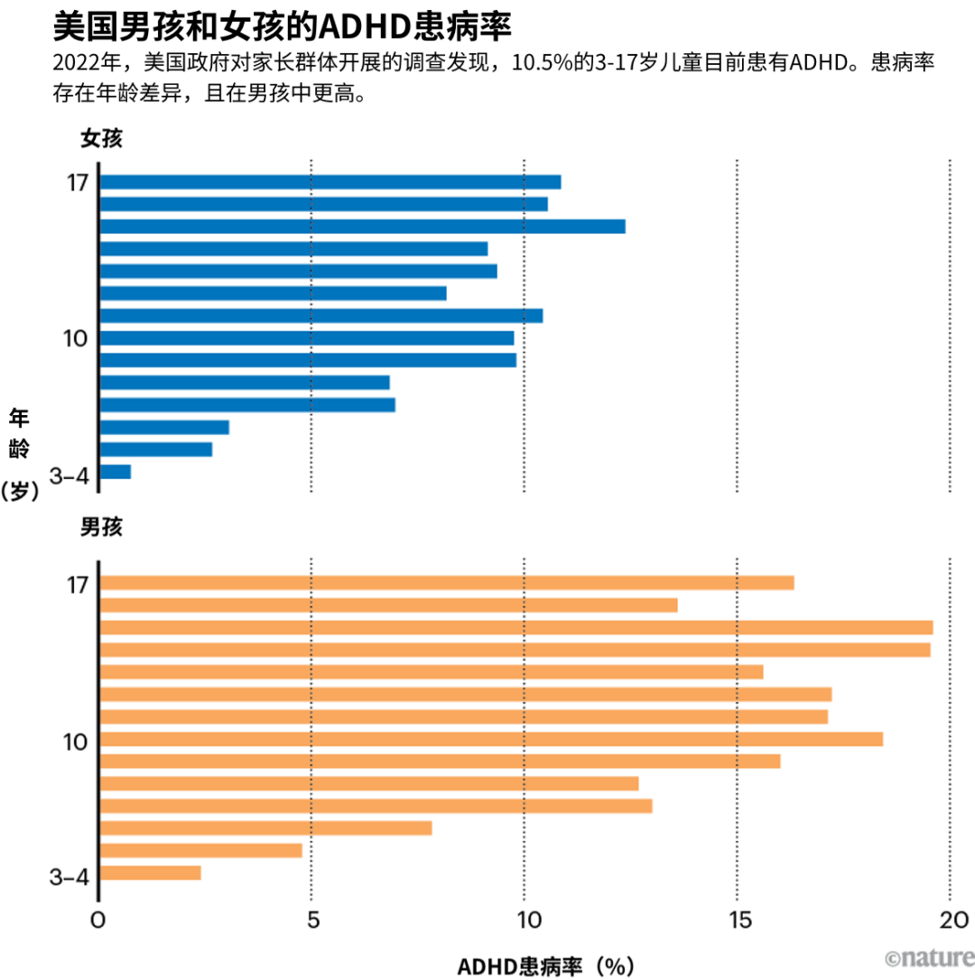 在世界上有些地区,被诊断出“注意力缺陷多动障碍”(ADHD)的人数正创下历史纪录。以美国为例,政府研究员在2024年报告称,超过11%的儿童在某个阶段接受过ADHD诊断[1]——比2003年的8%显著上升(见“美国男孩和女孩的ADHD患病率”)。