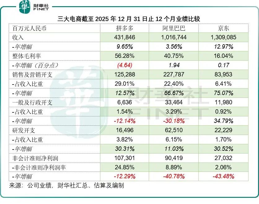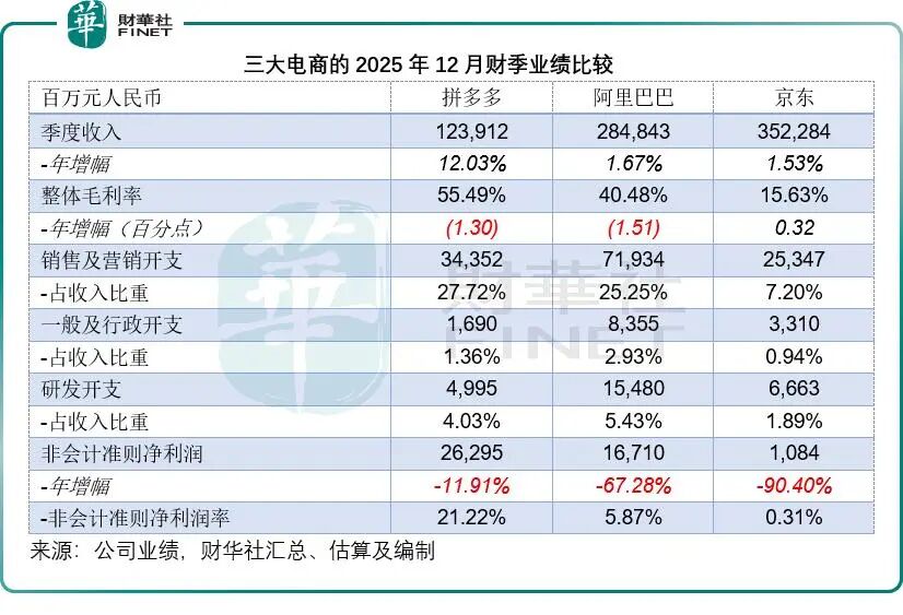 中国电商行业正式迈入存量竞争深水区。当用户红利和流量增量双双触及天花板,三家平台头部玩家——拼多多(PDD.US)、阿里巴巴(09988.HK)与京东(09618.HK),公布了表现各有差异的2025年12月财季答卷。