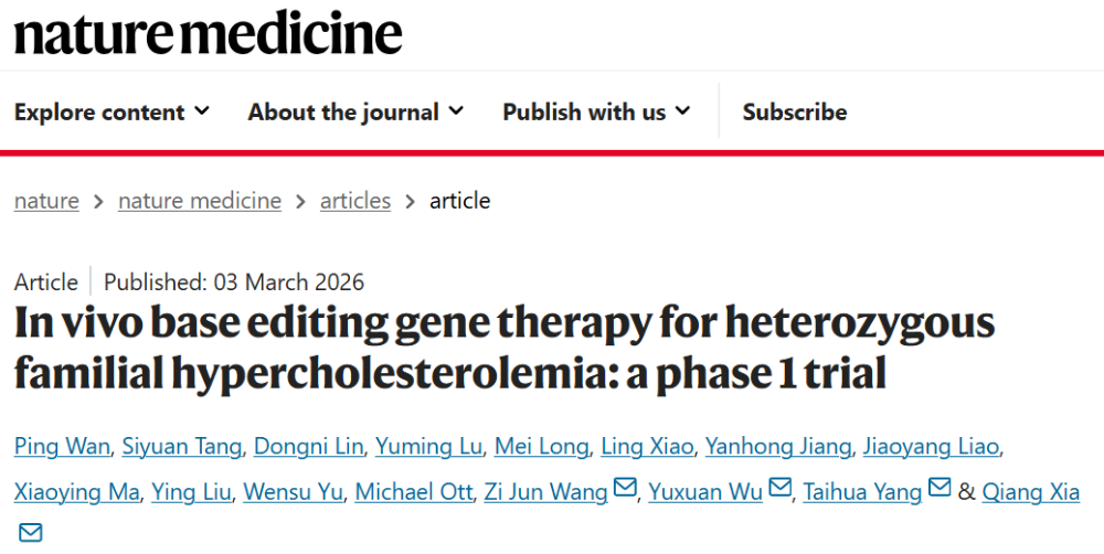 1.Wan, P., Tang, S., Lin, D. et al. In vivo base editing gene therapy for heterozygous familial hypercholesterolemia: a phase 1 trial. Nat Med (2026)./10.1038/s41591-026-04254-42.封思琴, 等. PCSK9抑制剂多效性的研究进展. 中华心血管病杂志. 2022年50卷03期*“医学界”力求所发表内容专业、可靠,但不对内容的准确性做出承诺;请相关各方在采用或以此作为决策依据时另行核查。
