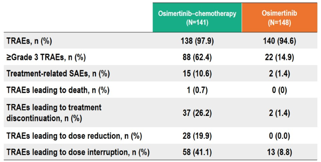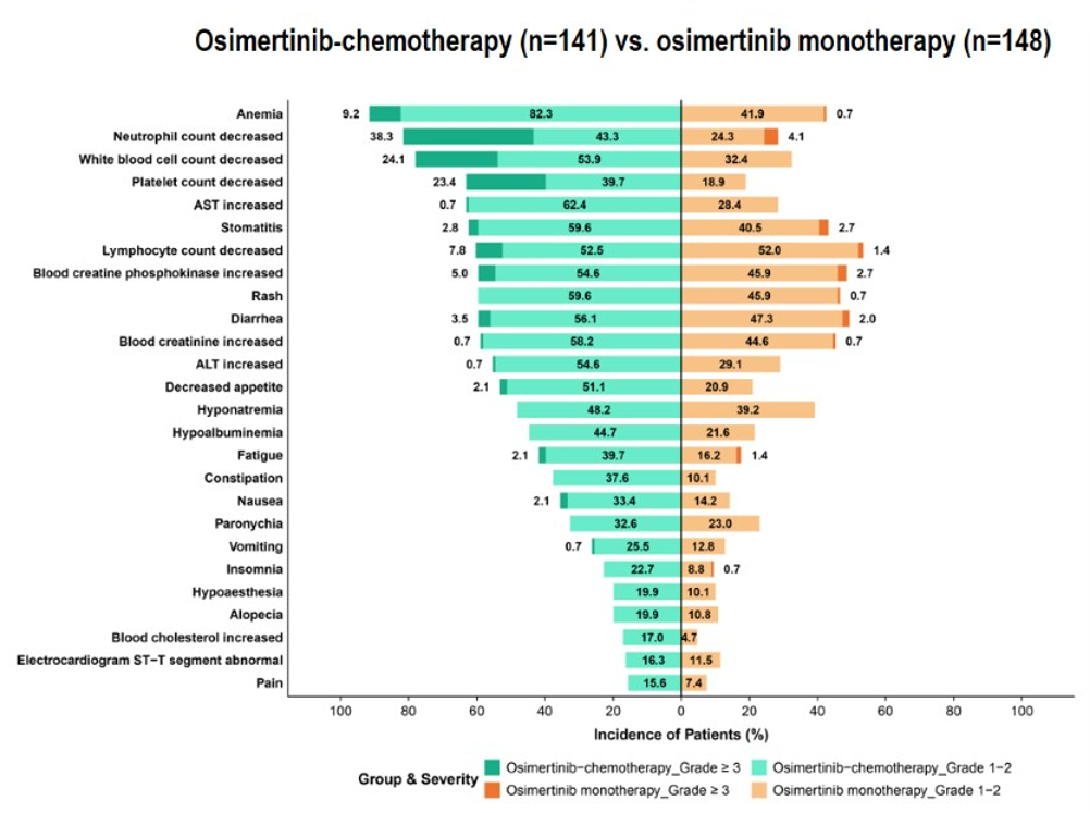 安全性方面,截至数据分析时,在联合治疗组中,培美曲塞治疗的中位周期数是17个周期(范围1-52),完成4周期含卡铂诱导治疗的患者比例达到84.4%。联合治疗组与单药治疗组奥希替尼的中位暴露时间分别为20.3个月(范围 1.1-53.6)和15.4个月(范围 0.5-53.9)。奥希替尼联合化疗组和单药治疗组的≥3级治疗相关不良事件(TRAE)发生率分别为62.4%和14.9%。奥希替尼联合化疗组最常见TRAE为血液学毒性,非血液学不良事件多为1-2级,整体安全性可控,且未观察到新的安全性信号。