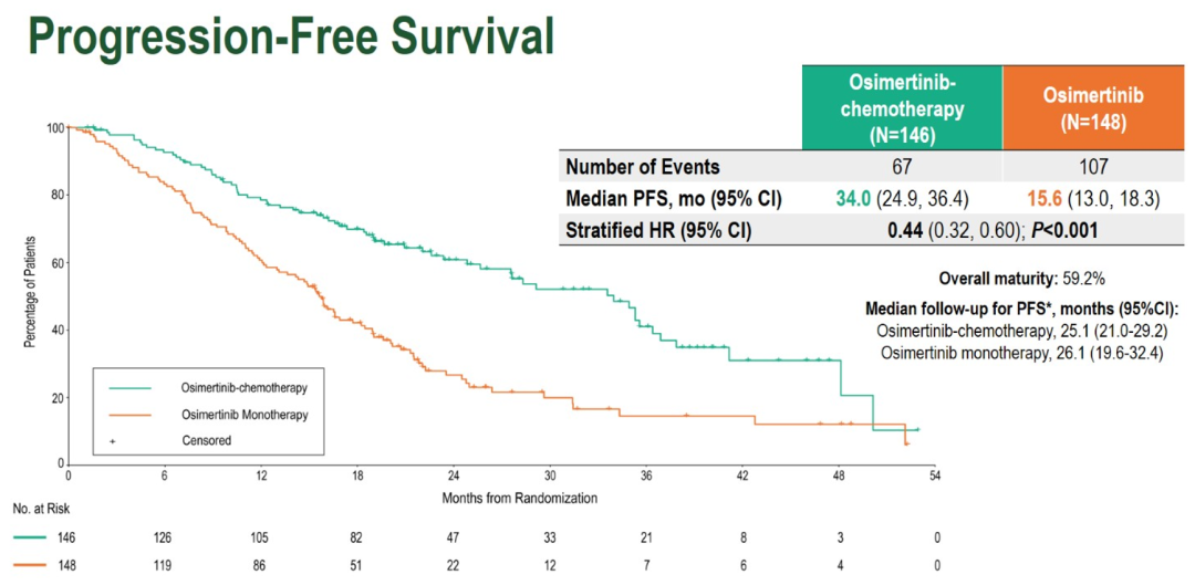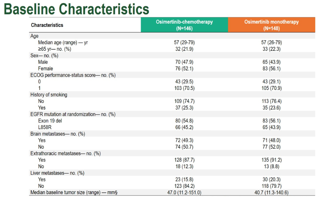 数据截至2025年11月11日。研究共纳入294例患者,按1:1随机分配至奥希替尼联合化疗组(n=146)或奥希替尼单药组(n=148)。两组基线特征总体均衡,约半数患者基线为EGFR L858R突变(45.2% vs 43.9%)或合并中枢神经系统转移(49.3% vs 48.0%),提示研究人群具有较高疾病负荷及预后不良特征。