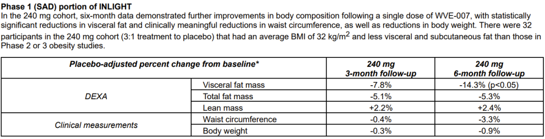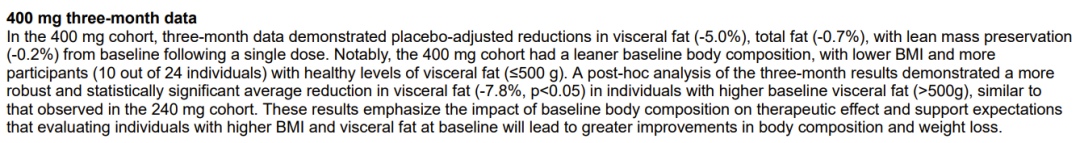 240mg WVE-007单次给药3个月内脏脂肪减少7.8%,6个月减少14.3%,总脂肪分别减少5.1%、5.3%,肌肉增加2.2%、2.4%。400mg WVE-007单次给药3个月内脏脂肪减少5.0%,总脂肪减少0.7%,肌肉减少0.2%。Wave Life Sciences指出400mg队列基线脂肪放量更少,BMI更低。对于内脏脂肪500g以上亚组分析,内脏脂肪减少7.8%,与240mg队列的数据相当。