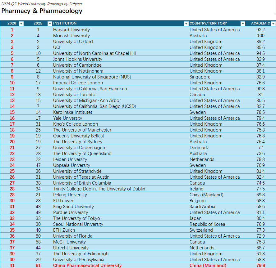 在最新的排名中,中国药科大学在药剂与药理学领域(Pharmacy and Pharmacology)取得了历史性突破,首次跻身全球第41位,成功跨入该学科全球前50强,实现了历史性跨越。