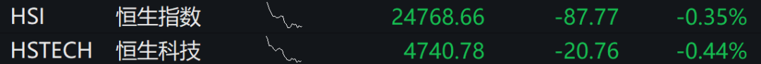 恒生指数低开0.35%,恒生科技指数跌0.44%。友邦保险、海尔智家跌逾3%,蔚来、小鹏汽车跌逾2%;比亚迪股份涨近3%。