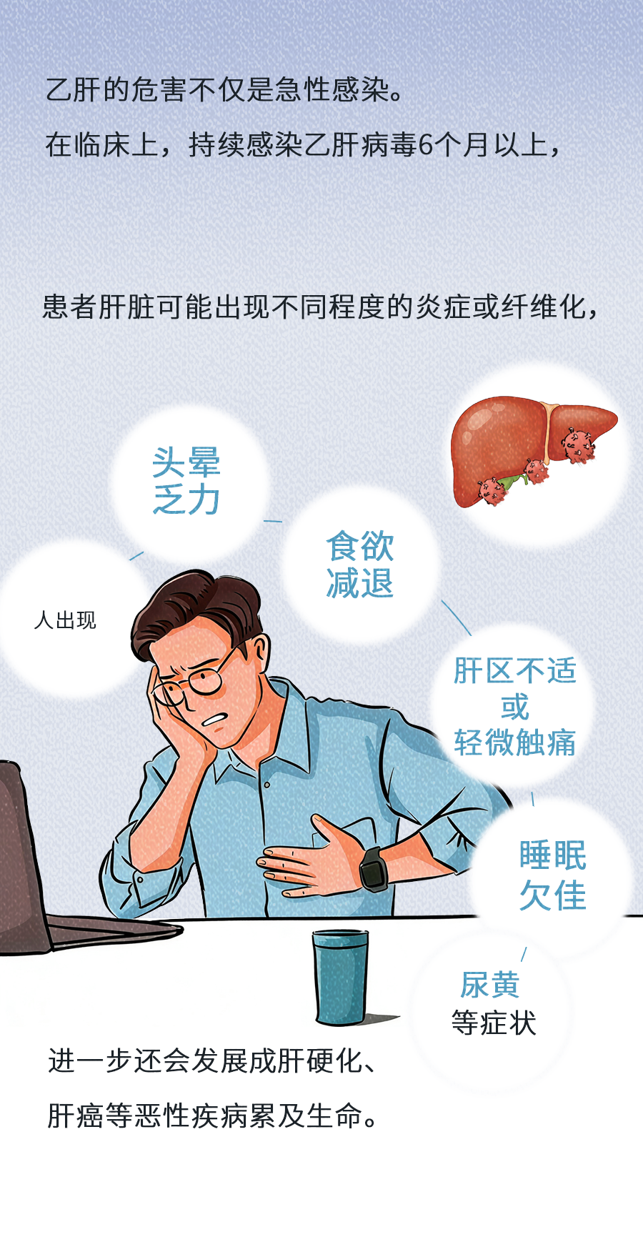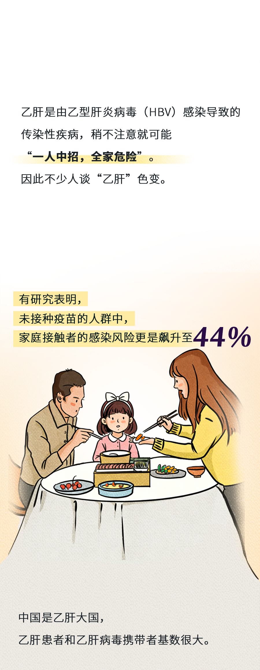 因此,相比治疗,预防乙肝传播更为重要。乙肝主要通过血液传播、母婴传播和性接触传播,大家在生活中不需要过于担忧,日常学习、工作场景中,如处在同一空间中、握手、拥抱、共用厕所等,通常不会造成传染。给家人接种乙肝疫苗、养成独立卫生习惯、定期筛查,可以降低感染乙肝病毒的风险,保护自身和他人的健康。