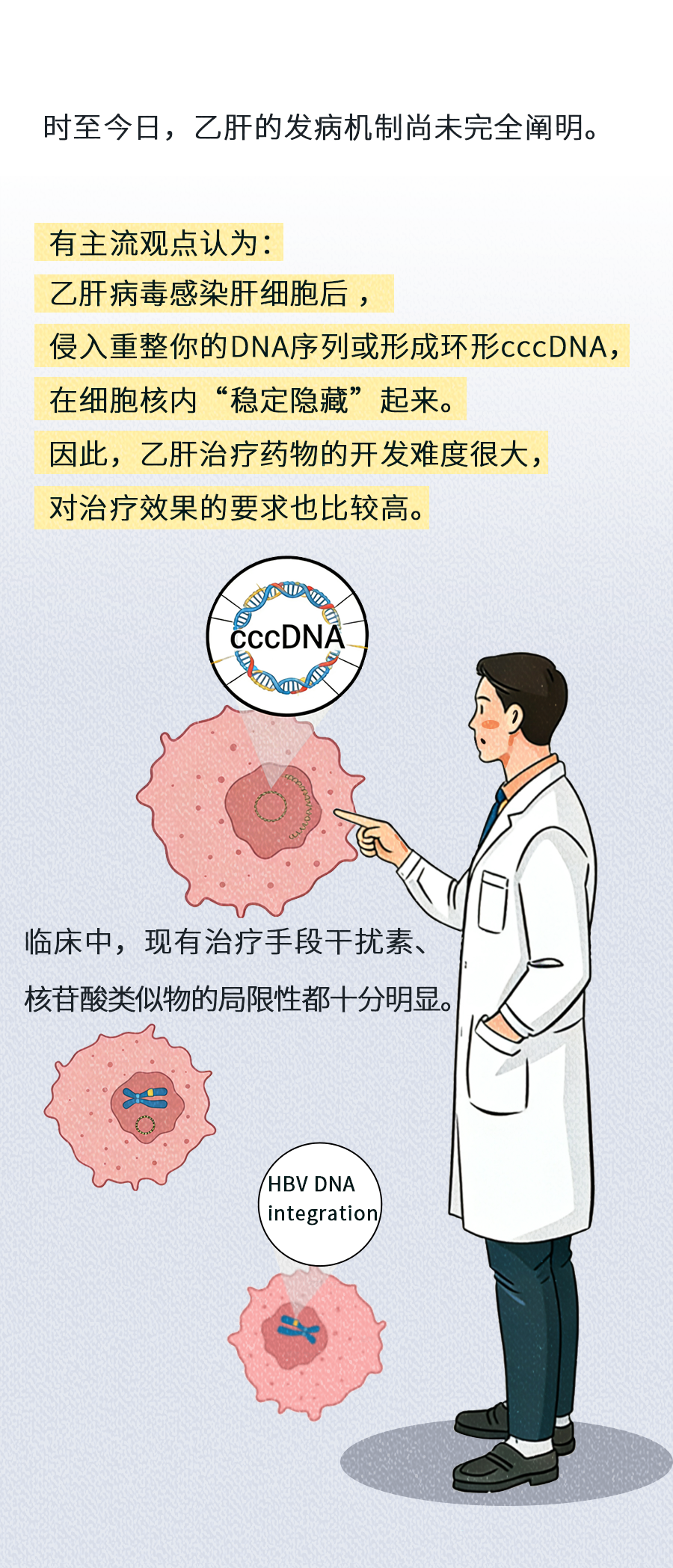值得注意的是,上文提到的功能性治愈并不等于完全治愈。《中国慢性乙型肝炎防治指南》中将乙肝的“功能性治愈”定义为:停止治疗后乙肝表面抗原(HBsAg)持续阴性,伴或不伴乙肝表面抗体(抗-HBs),乙型肝炎DNA低于最低检测下限,肝脏生物化学指标正常,肝细胞核内可能仍存在cccDNA。