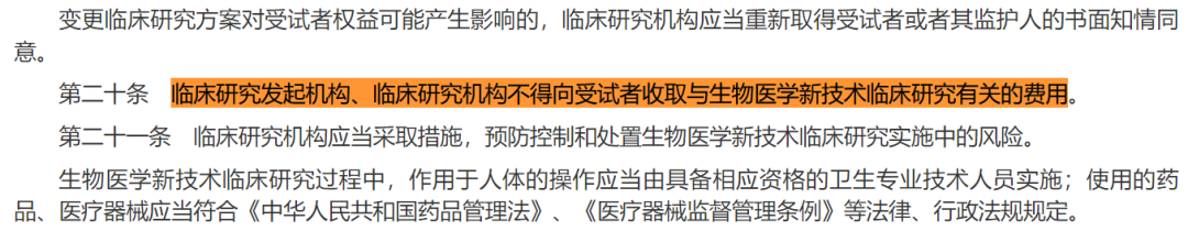 第二十条是最致命的一条:“临床研究发起机构、临床研究机构不得向受试者收取与生物医学新技术临床研究有关的费用。”