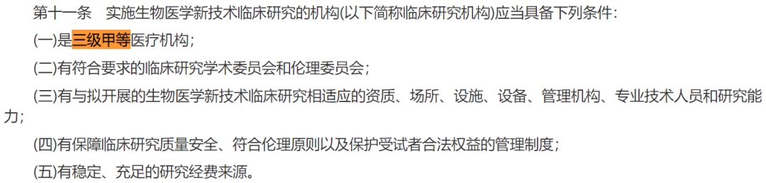 第十一条写得清清楚楚:实施生物医学新技术临床研究的机构,必须是三级甲等医疗机构,要有符合要求的学术委员会和伦理委员会,要有稳定充足的研究经费来源。