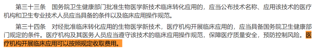 第三十四条给出了出口:“经批准临床转化应用的生物医学新技术,医疗机构开展临床应用的,可以按照规定收取费用。”