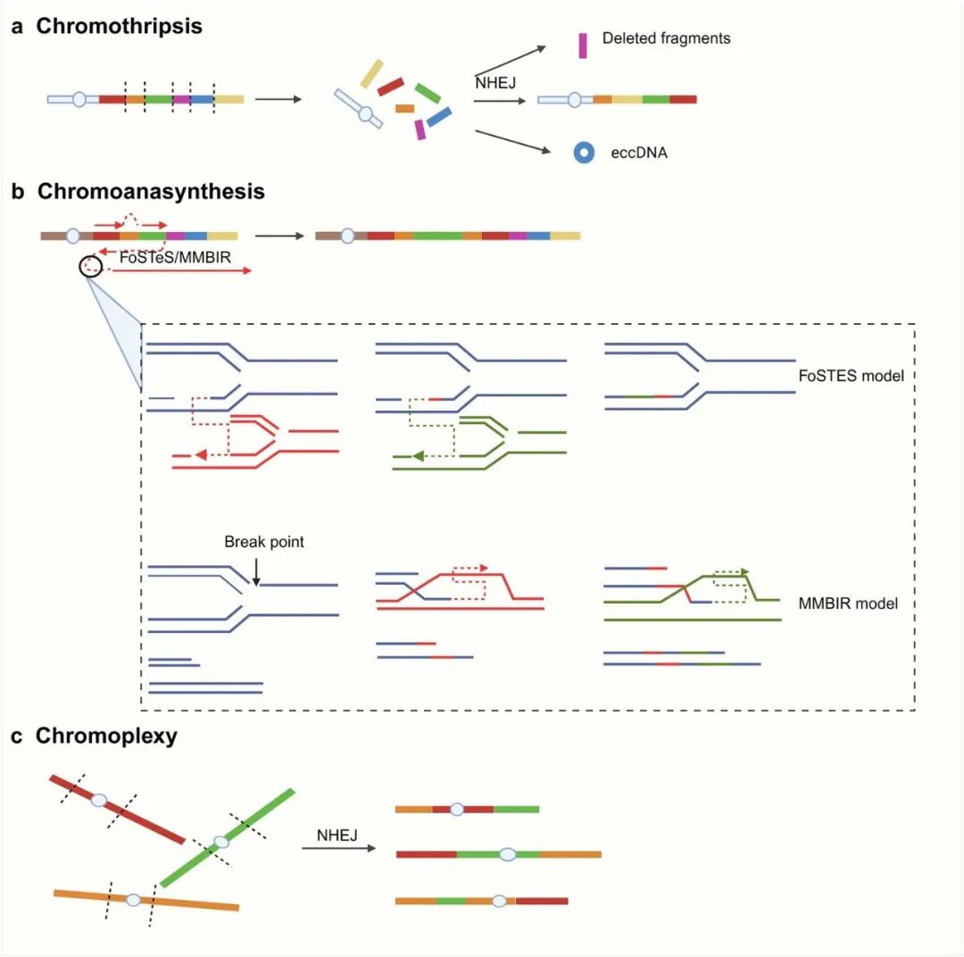微核膜因缺乏核纤层蛋白B等关键结构蛋白而异常脆弱,容易破裂。破裂会将内部的遗传物质释放到细胞质中,这带来两个关键后果:一是可能激活cGAS-STING固有免疫通路,引发炎症反应;二是可能导致极端形式的基因组灾难——染色体碎裂。染色体碎裂是指在单次细胞危机中,少数染色体上发生数十至数百处DNA双链断裂,并以错误方式随机重组的现象,这是驱动肿瘤基因组进化和癌基因扩增的重要机制。研究表明,微核正是染色体碎裂的关键起源地。
