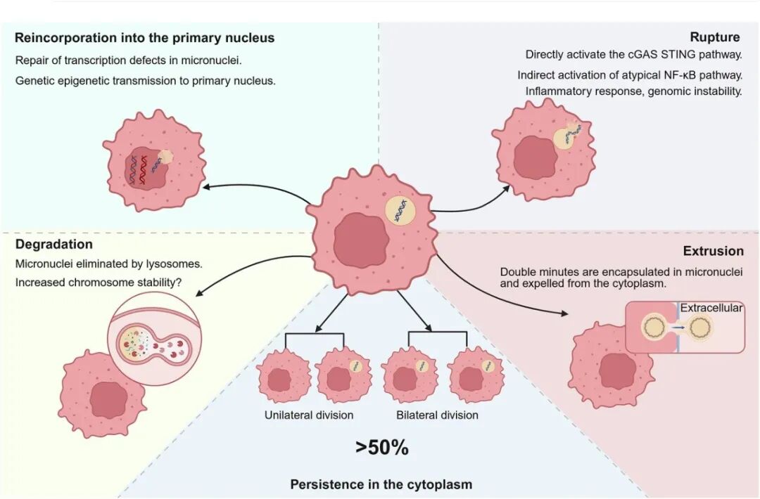 然而,新证据不断揭示,微核并非被动的旁观者。一旦形成,它们能通过多种活动深刻影响宿主细胞。这些活动包括:重新融入主核、在细胞质中持续存在、膜破裂、被细胞自噬机制降解,以及被挤出细胞外。其中,膜破裂是最受关注的事件之一。