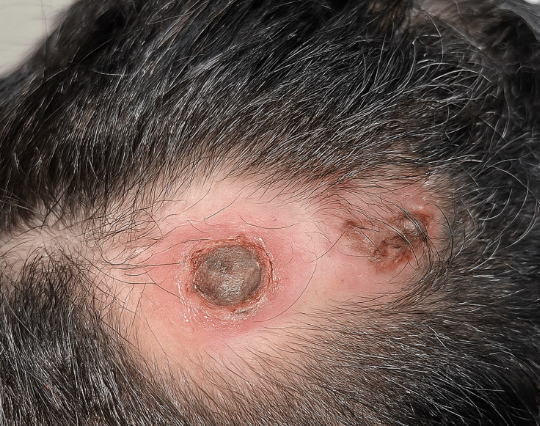 于是,张医生让患者坐下检查,发现在患者头皮上,散布着多个直径约1.5cm的类圆形结节,中央凹陷,像一个个微型火山口,里面塞着坚硬的角质性“栓子”。部分结节已经破溃,表面覆盖着血痂和脓痂(图1)。