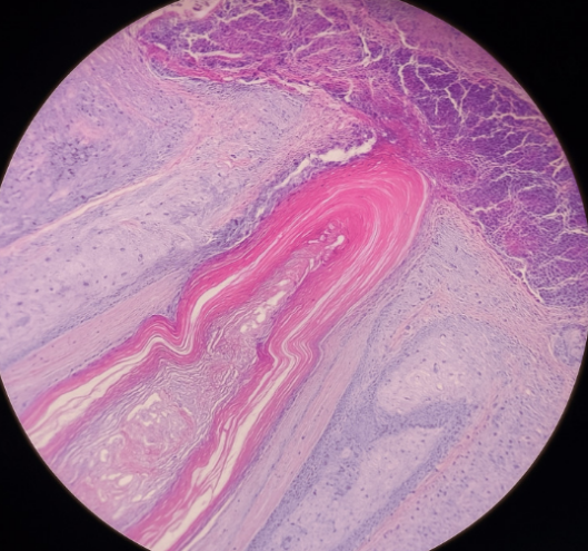 显微镜下显示:鳞状上皮伴有棘皮症和角化过度,覆盖着厚厚的纤维蛋白-白细胞壳、含有中央角膜栓的滤泡漏斗,以及富含中性粒细胞的滤泡周围淋巴浸润。同时,皮损处的细菌培养检出了甲氧西林敏感的金黄色葡萄球菌。