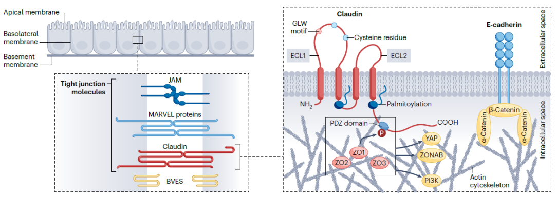 编者按:实体瘤治疗正迈入精准靶向与多模态创新并行发展的新阶段。近年来,claudin(CLDN)蛋白因其在多种肿瘤中的异常表达及细胞表面可及性,逐渐成为备受关注的新兴治疗靶点。2024年,靶向CLDN18.2的抗体药物Vyloy(zolbetuximab)获得美国FDA批准,用于特定胃癌患者的一线治疗,这一里程碑式进展不仅验证了CLDN作为可成药靶点的临床价值,也进一步推动了抗体偶联药物(ADC)、双特异性抗体及CAR-T等多种创新疗法在该领域的快速发展。与此同时,随着CLDN靶向药物向更复杂的分子形式演进,其在临床研发中的挑战也日益凸显。作为全球医药及生命科学行业值得信赖的合作伙伴,药明康德依托一体化CRDMO平台,持续完善包括ADC在内的复杂分子研发能力体系,为全球合作伙伴提供从早期研究到IND申报的系统性支持,加速创新疗法的开发进程。本文将依据近期于《自然》子刊Nature Reviews Cancer所发布关于CLDN蛋白的综述内容,并结合公开资料,向读者介绍CLDN靶向疗法的临床进展,探讨这一新兴靶点在精准肿瘤治疗中的发展前景。