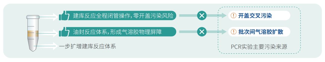 采用创新一步法扩增建库体系,建库反应全程闭管操作,并搭配油封反应设计形成气溶胶物理屏障,从源头杜绝污染,远离假阳性干扰,保障检测结果的可靠性。