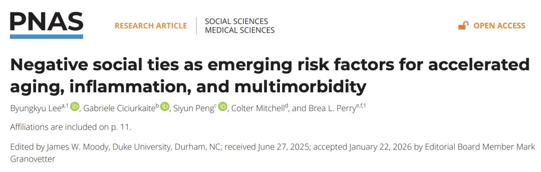 近日,印第安纳大学伯明顿分校的研究人员在《美国国家科学院院刊》(PNAS)上发表了题为:Negative social ties as emerging risk factors for accelerated aging, inflammation, and multimorbidity 的研究论文。