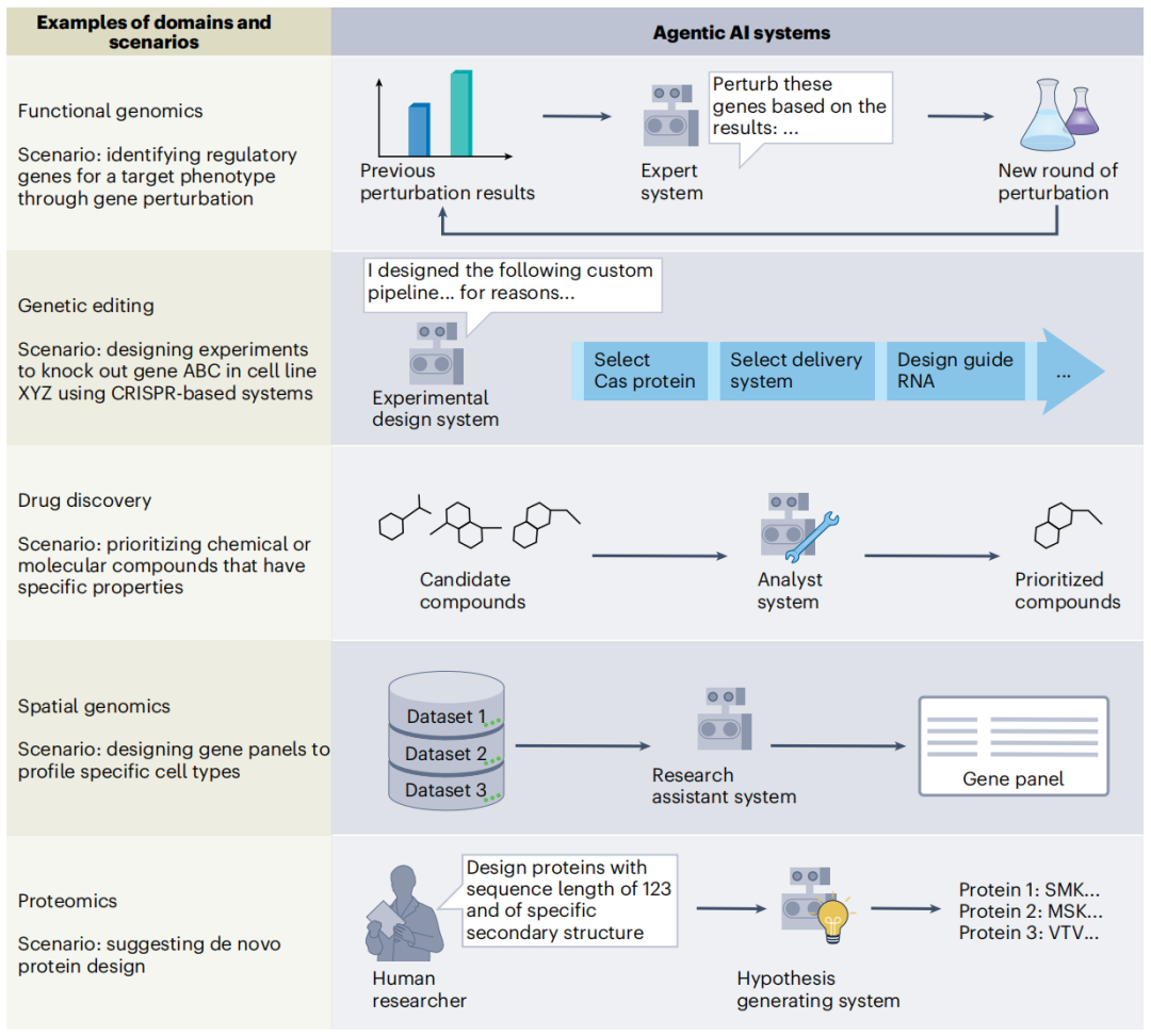 生物医学研究各个领域(功能基因组学、基因组编辑、药物发现、空间基因组学、蛋白组学)中的 Agentic AI 系统案例