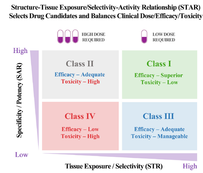 究竟是什么导致了如此惨烈的失败率?根据2010年至2017年临床试验数据的系统分析,可以归结为四大类原因:缺乏临床疗效(40%-50%)是导致失败的首要原因。这反映了基础研究阶段的“原罪”——动物模型的预测能力有限。一个在转基因小鼠模型中效果惊艳的化合物,进入人体后可能完全无效。这种“动物与人”的鸿沟是T1转化失败的核心。图2结构-组织选择性/暴露活性关系(STAR)能够筛选出更优的候选药物,并平衡临床剂量/疗效/毒性,从而优化药物以促进临床药物开发的成功不可控的毒性(30%)位列第二。这类失败往往发生在临床后期,当药物在更大范围的患者群体中测试时,之前未发现的毒性问题突然暴露。某些毒性机制在动物模型中无法有效预测,如某些免疫相关不良反应。药物样特性差(10%-15%)曾是1990年代的主要失败原因,当时占失败案例的30%-40%。如今这一比例已显著下降,得益于行业对ADME(吸收、分布、代谢、排泄)性质的早期优化重视。溶解度、渗透性、代谢稳定性等成药性指标已成为候选化合物筛选的核心标准。商业因素与战略规划(10%)同样不容忽视。治疗重点的变更、公司并购导致的管线重叠、市场格局的变化,都可能让一个技术上有望成功的项目戛然而止。三、“死亡之谷”的多维成因