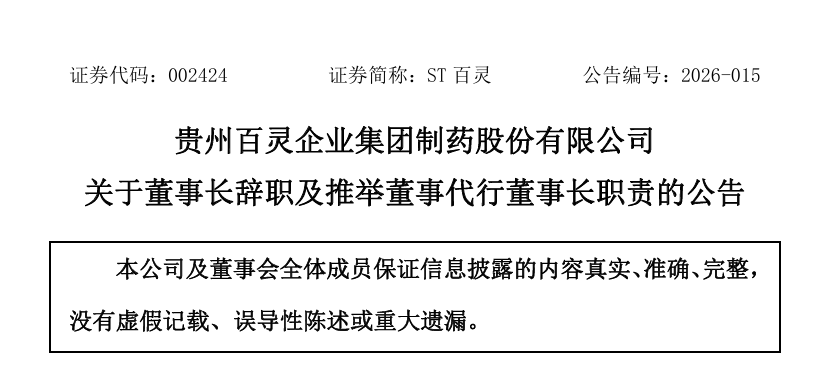 贵州百灵企业集团制药股份有限公司于2026年3月26日收到公司董事长姜伟先生提交的书面辞职报告,其因个人原因申请辞去公司董事长、董事、代行董事会秘书、董事会下设战略委员会召集人、提名委员会、薪酬与考核委员会委员及法定代表人职务。