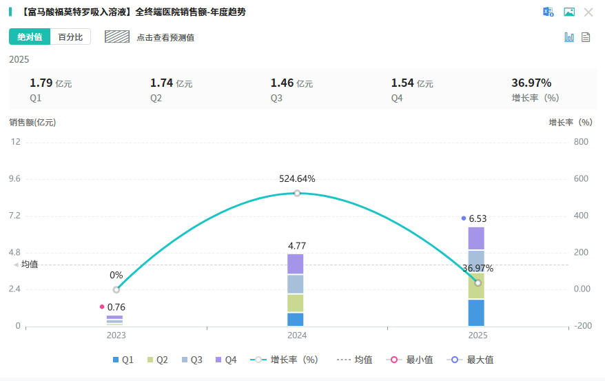 福莫特罗作为长效β2受体选择性激动剂(LABA),是临床治疗慢阻肺与哮喘的核心用药,可有效扩张支气管、显著改善患者肺功能。摩熵医药数据显示,该品种在2025年全终端医院市场销售额突破6亿元,同比增长高达36.97%,市场规模持续扩大。
