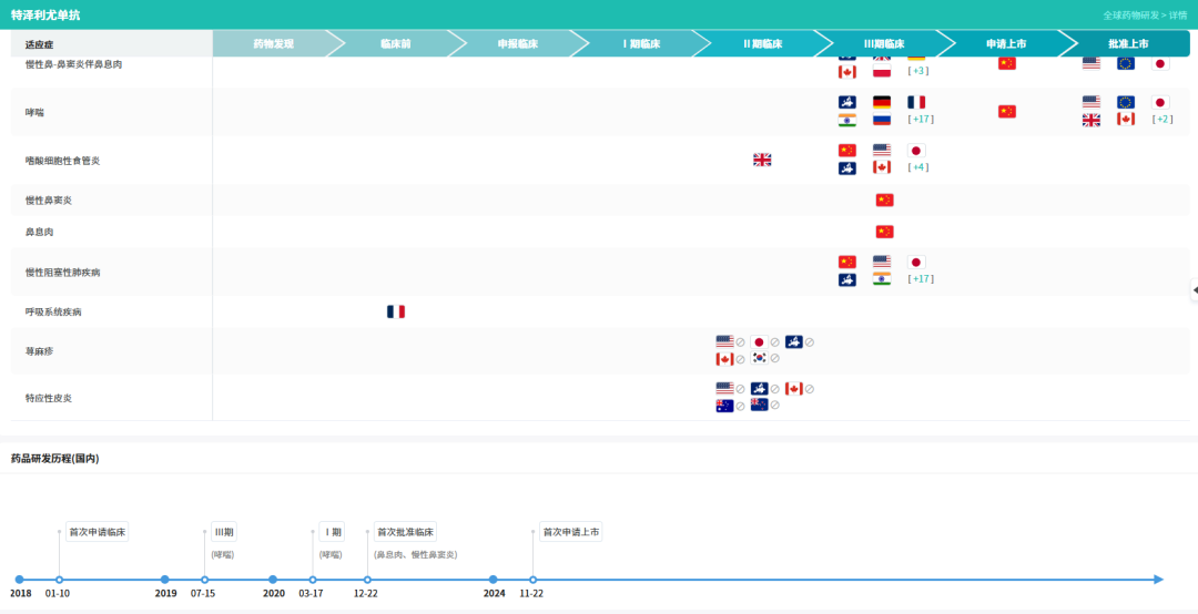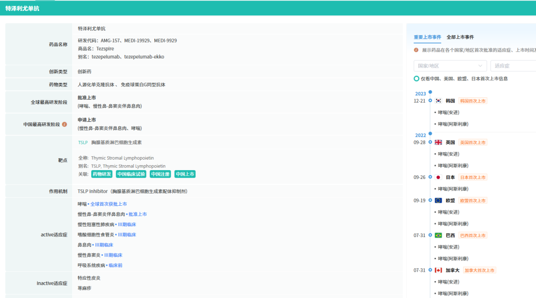 摩熵医药数据显示,在中国,特泽利尤单抗此前已针对哮喘、嗜酸性粒细胞性食管炎、慢性鼻窦炎伴鼻息肉病、慢性阻塞性肺疾病等适应症开展了多项III期临床试验,展现了其在呼吸与炎症领域的广阔应用前景。