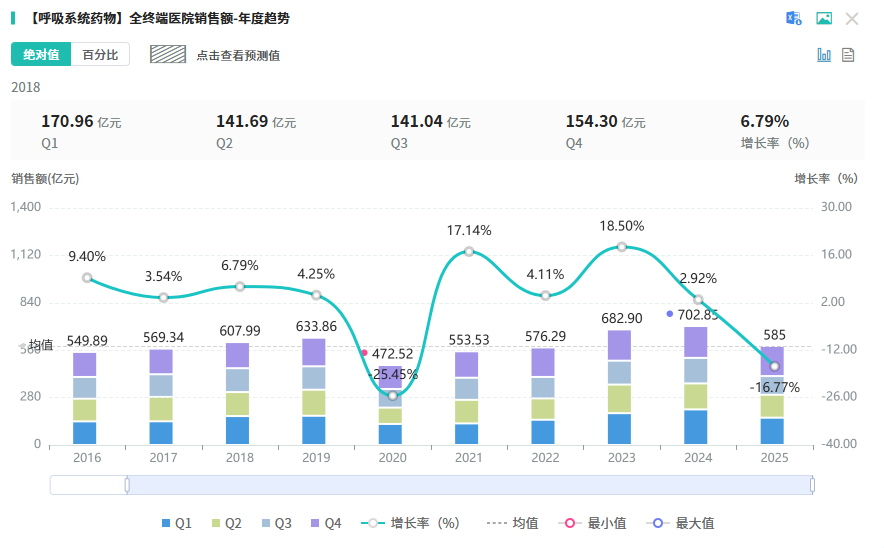 呼吸系统疾病中成药市场空间广阔,且保持稳定增长。摩熵医药数据显示,呼吸系统疾病中成药在2024年全终端医院市场的销售额已突破700亿元,同比增长2.92%。2025年前三季度销售额也超过500亿元,市场需求旺盛。