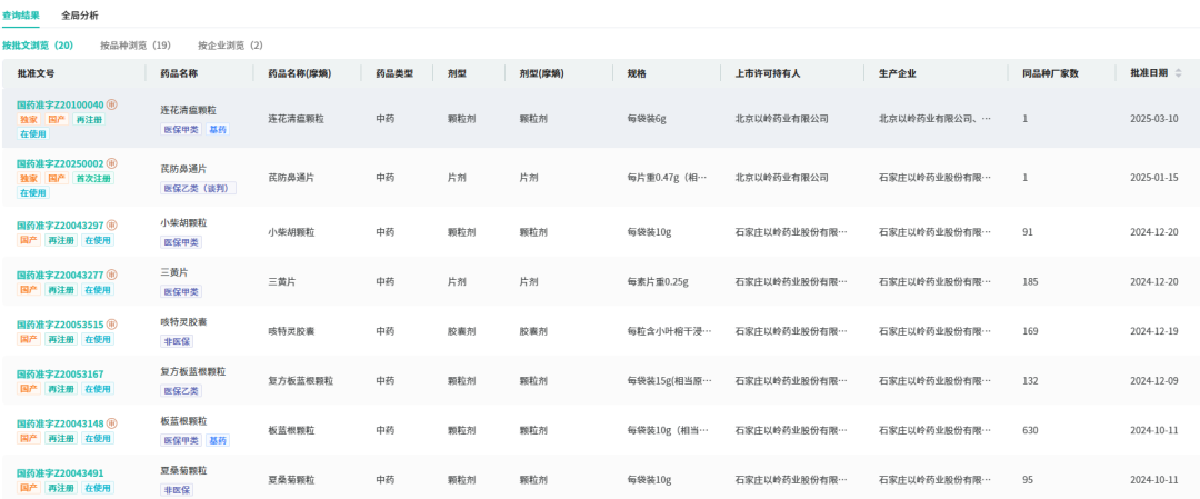 呼吸系统疾病用药是以岭药业长期深耕的核心领域之一,其市场地位建立在丰富的产品矩阵之上。目前公司拥有19款呼吸系统中成药的生产批文,其中有连花清瘟颗粒、芪防鼻通片、连花清瘟胶囊、连花清咳片、连花清瘟片5款独家品种。
