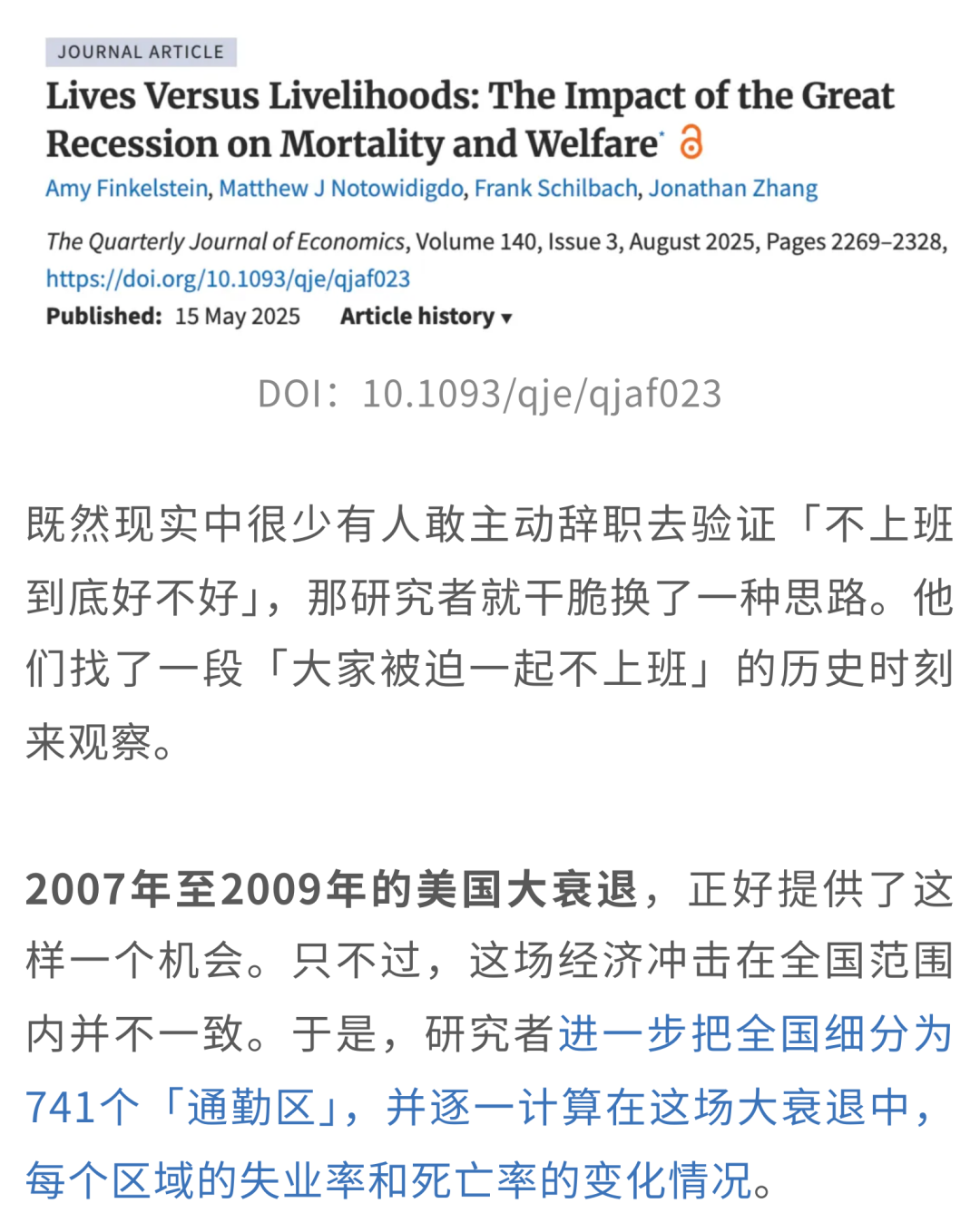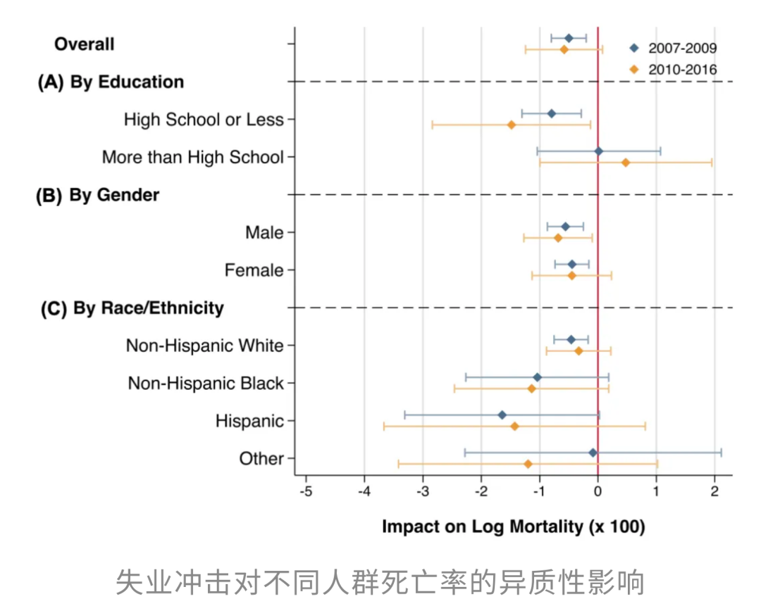 他们发表于Quarterly Journal of Economics的一项研究[1]表明,「不上班」所伴随的经济活动减少,反而带来了健康收益。美国大衰退期间,失业率上升与死亡率显著下降相关,而且这种影响至少持续了10年。