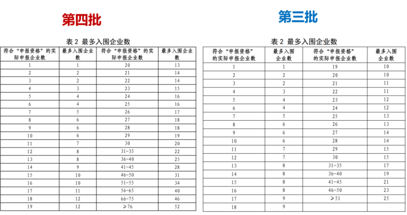 入围机制呈现“扩容提质”特征。与第三批相比,入围数量和比例双提升,延续“计分排位”核心逻辑:同单元按综合得分降序确定名额,实行定额管控。当申报企业数≥76家时,最多入围52家,既保证充分竞争又避免过度淘汰。
