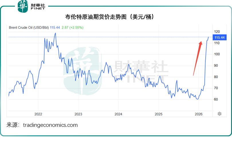 2026年开年,中东局势与霍尔木兹海峡航运风险成为油市核心导火索。见下图,原油价格随消息面大幅波动,布伦特原油期货价格从2025年末每桶60.75美元,飙升至当前的115.44美元,涨幅高达90%,高波动、高风险溢价成为2026年油市核心特征。